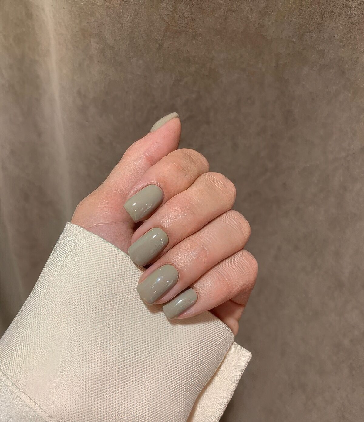 A soothing shade of muted green covers the nails, inviting a sense of calm and tranquility.