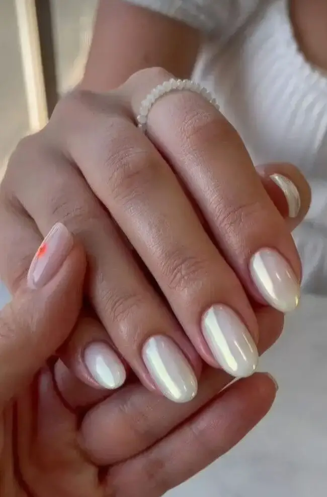 A stunning set of nails glistens with a pearly sheen, reflecting light like delicate seashells.