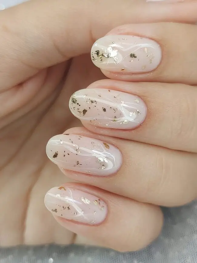 A gentle nude base highlights the delicate shimmer of tiny golden specks, capturing light in a playful dance.