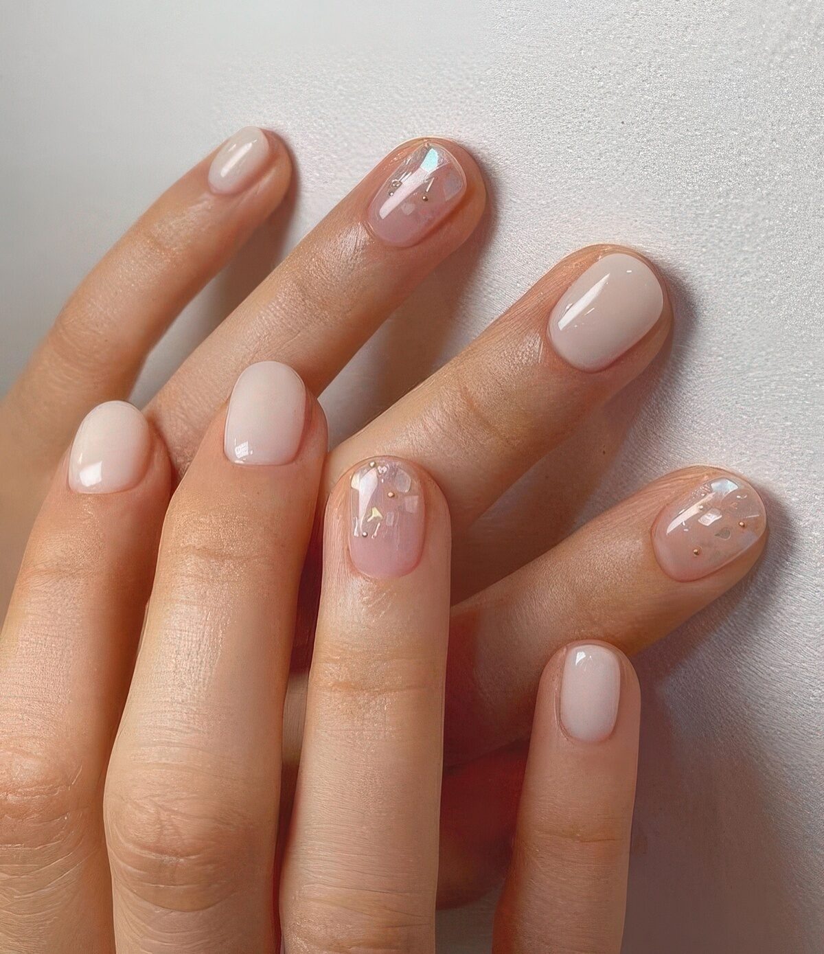 A soft nude base pairs beautifully with iridescent tips that reflect light like a gentle rainbow.