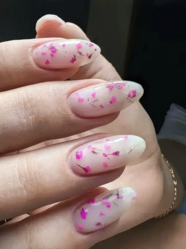 Delicate blossoms dance across a backdrop of soft hues, bringing an enchanting touch to your nails.