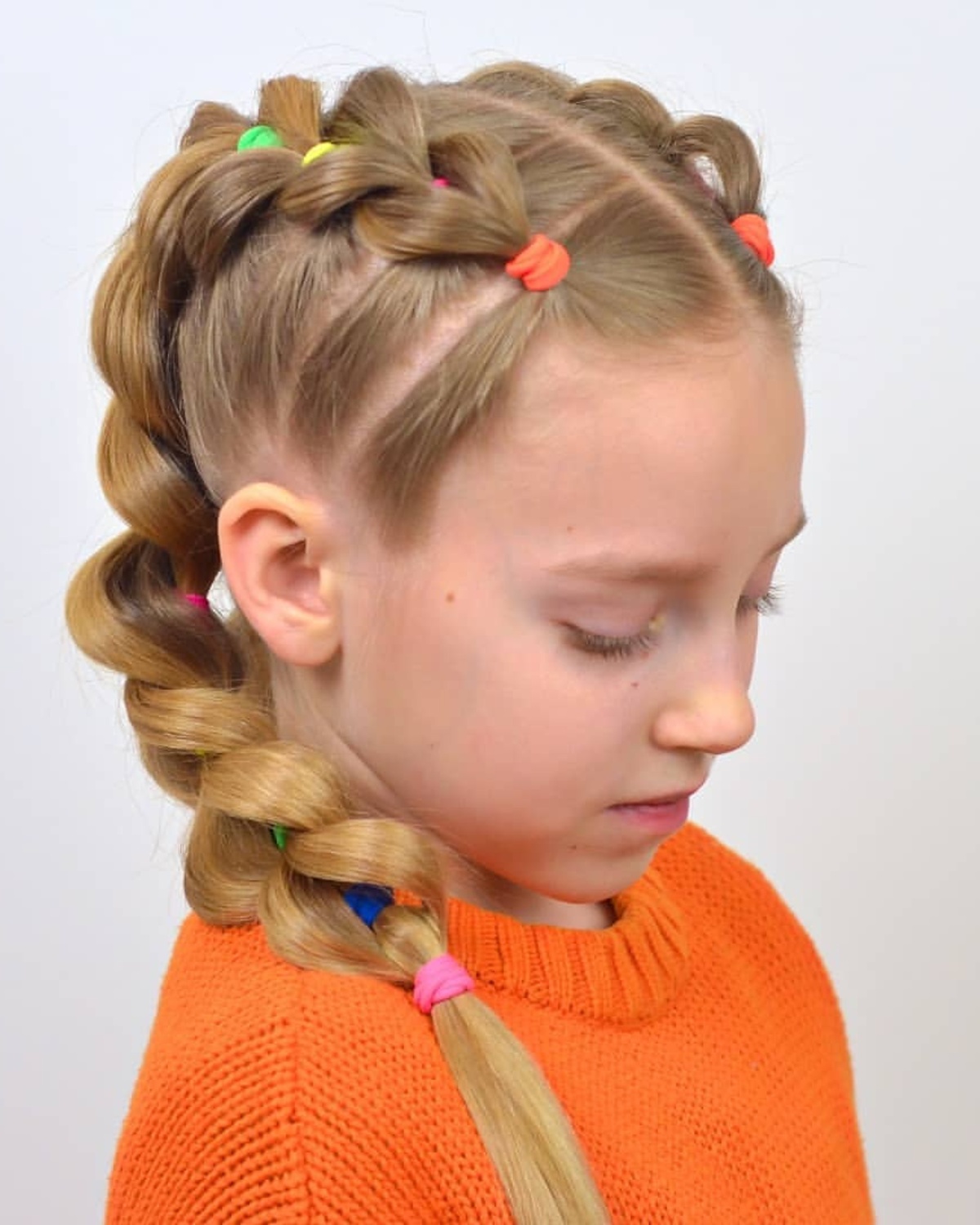 The hair is braided in sections and gathered into a bun at the top, where colorful elastics add a playful, rainbow-inspired finish.