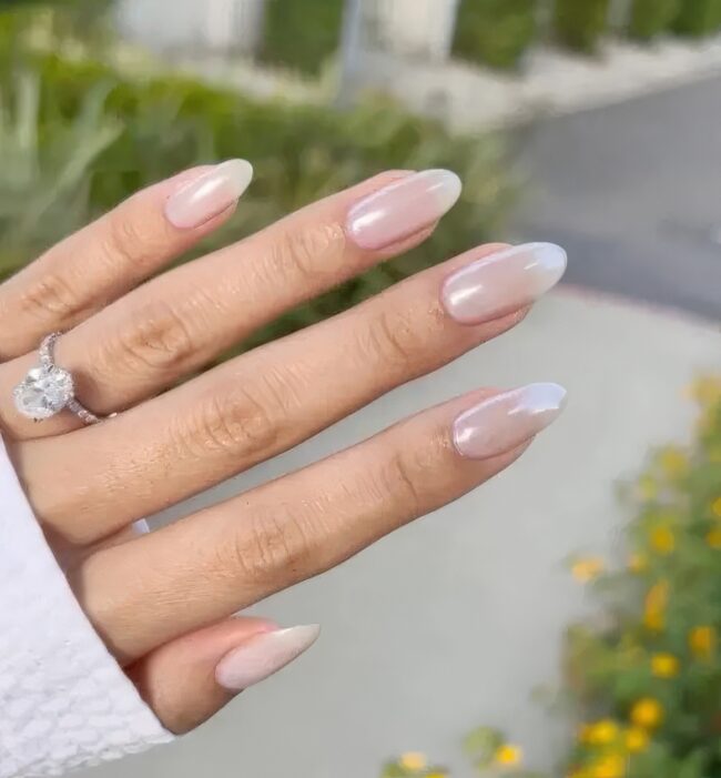 The look is achieved by layering a sheer nude or milky white base with a chrome or pearlescent powder for a soft, glowing effect.