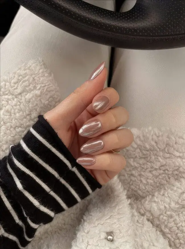 Classy almond-shaped chrome blush nails catch the eye with their elegant design.