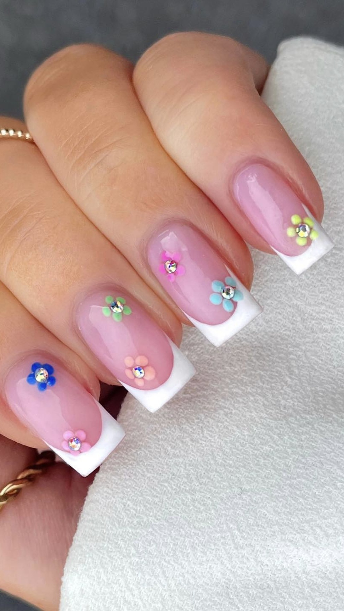 This design adds an elegant, floral twist to the timeless French tip, perfect for a springtime celebration.