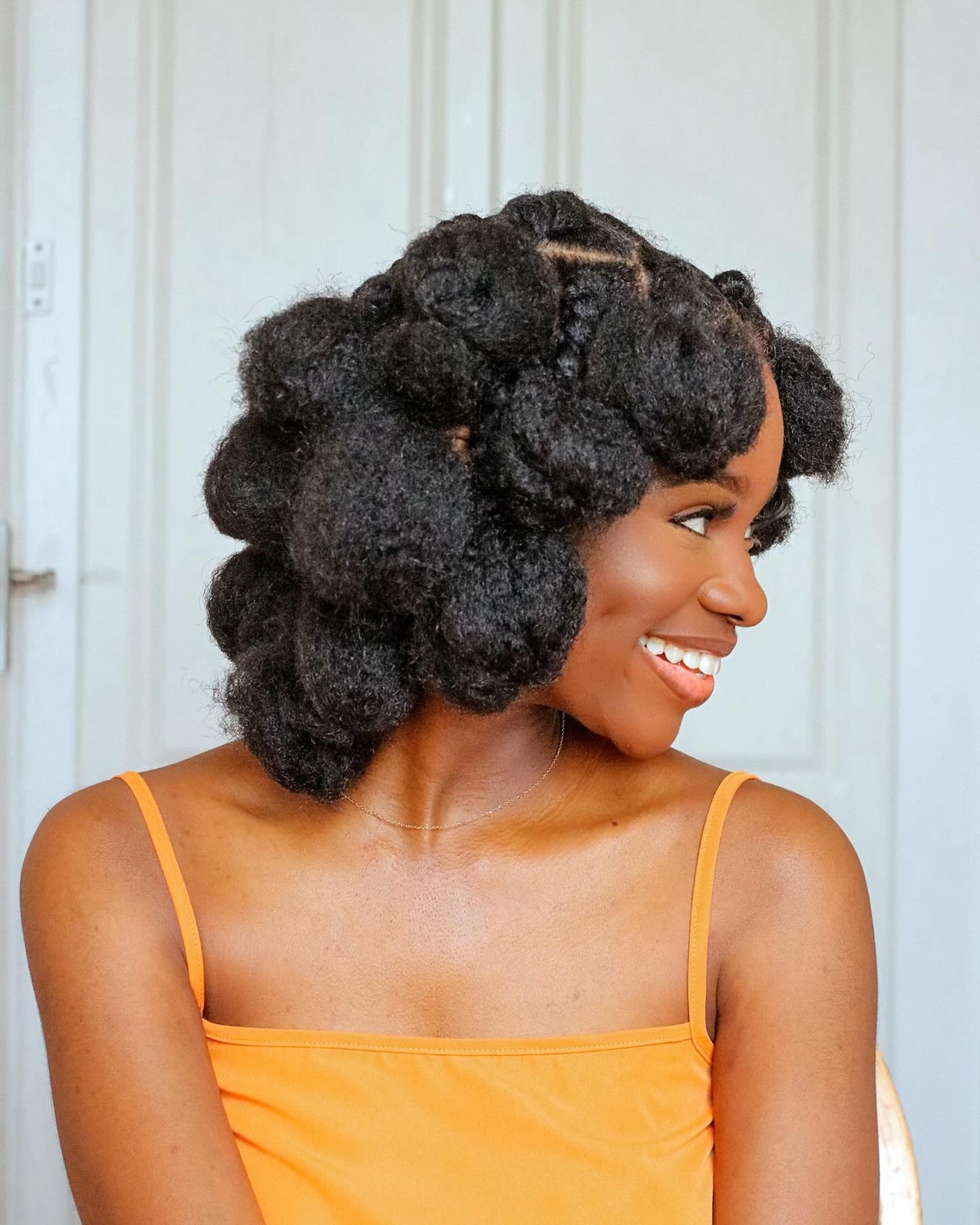 The styled Bantu knot-out creates voluminous, defined curls that radiate natural beauty.