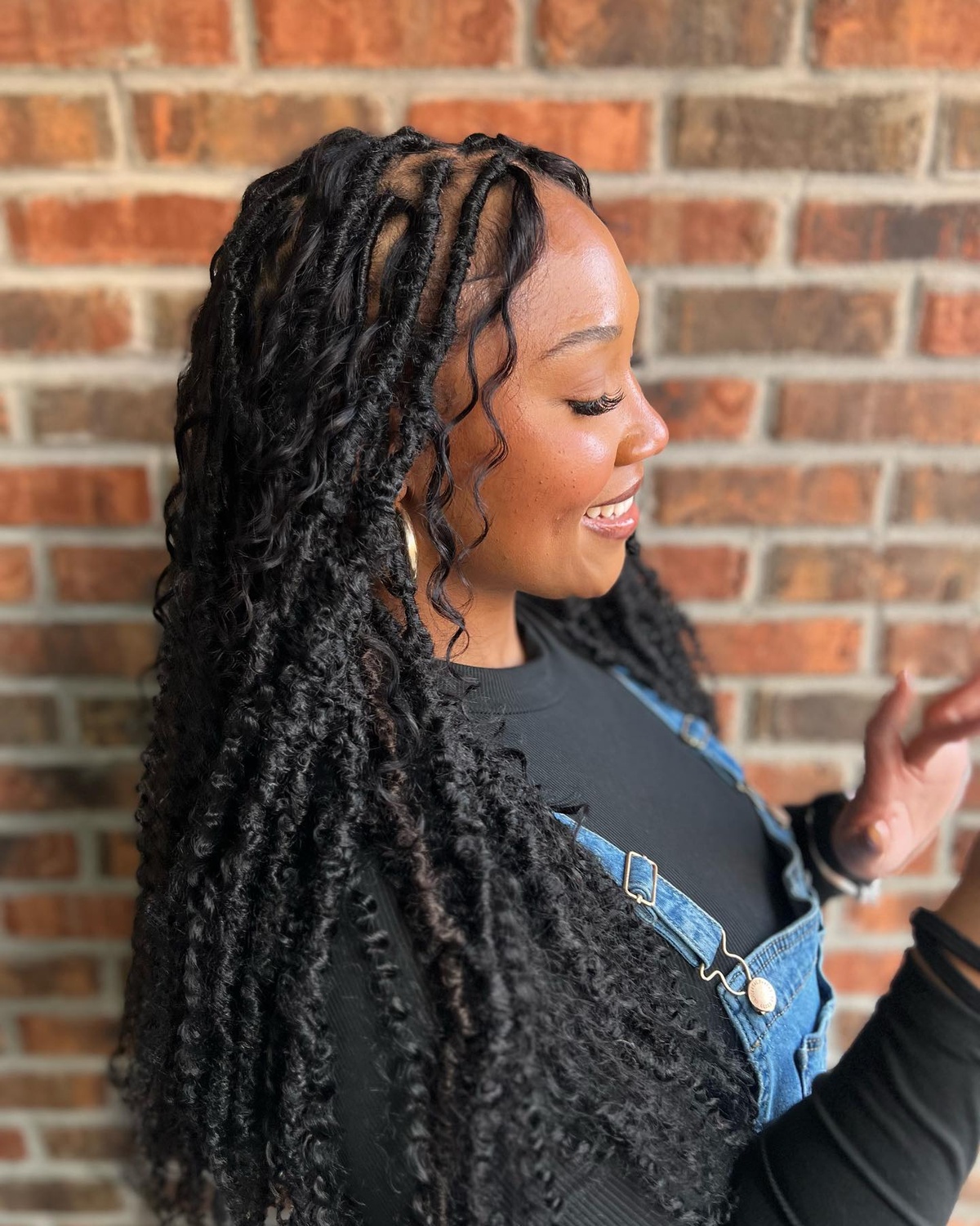 The locs cascade down effortlessly, offering a bohemian, free-spirited look that’s perfect for summer festivals or laid-back gatherings.