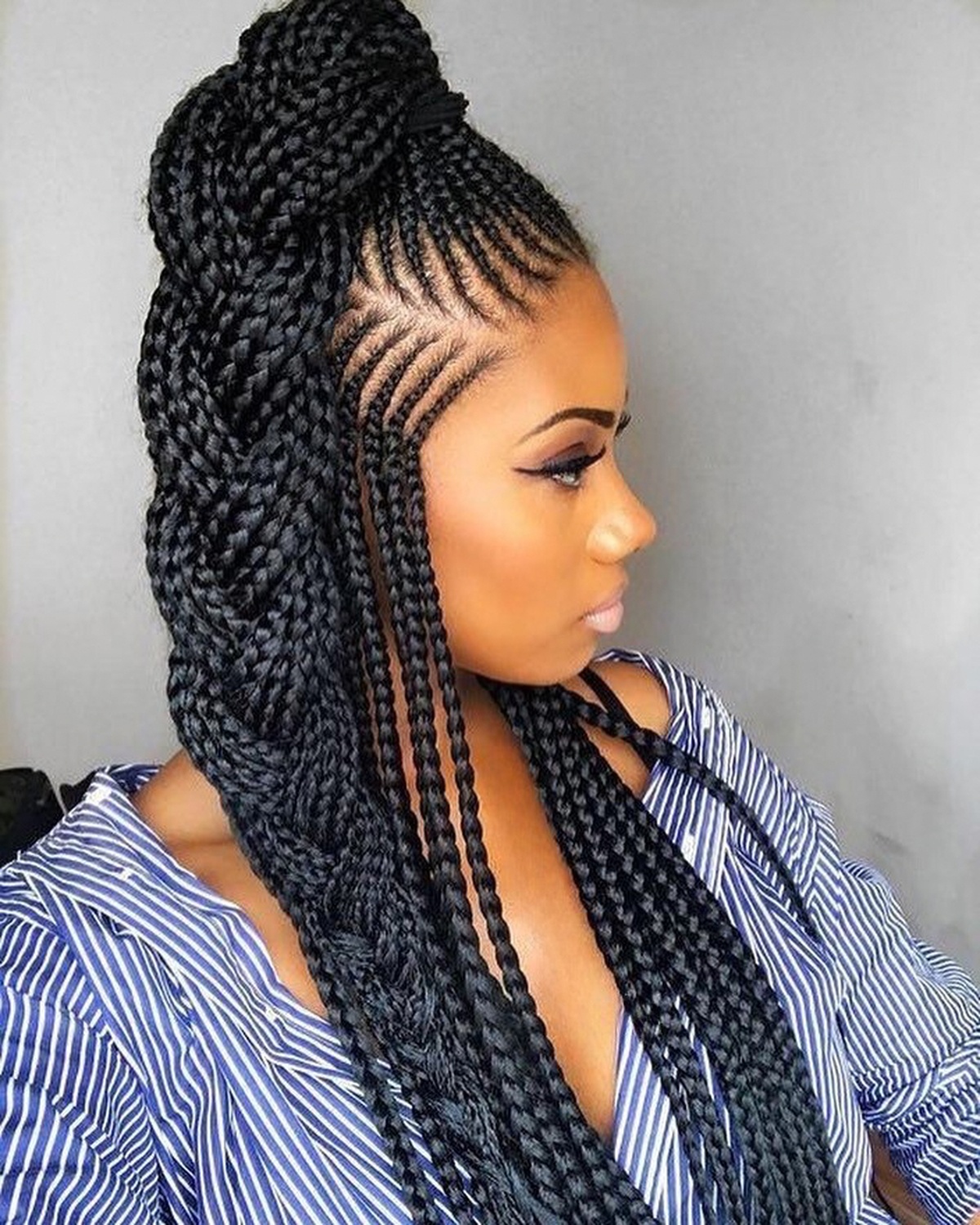 The braids are woven into an elaborate pattern, culminating in a stunning bun or twist that sits high on the head.