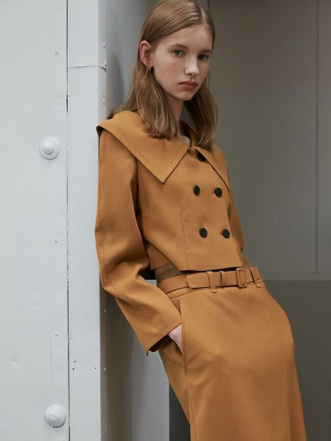 High-waisted pants and a belted waist enhance the silhouette, creating a sleek, cohesive outfit.