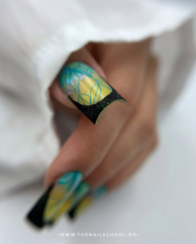Elegant black and yellow floral accents bring a refined, artistic flair to these nails. The delicate yellow flowers against a bold black French tip create a stunning contrast, perfect for those who love a touch of drama while staying sophisticated.
